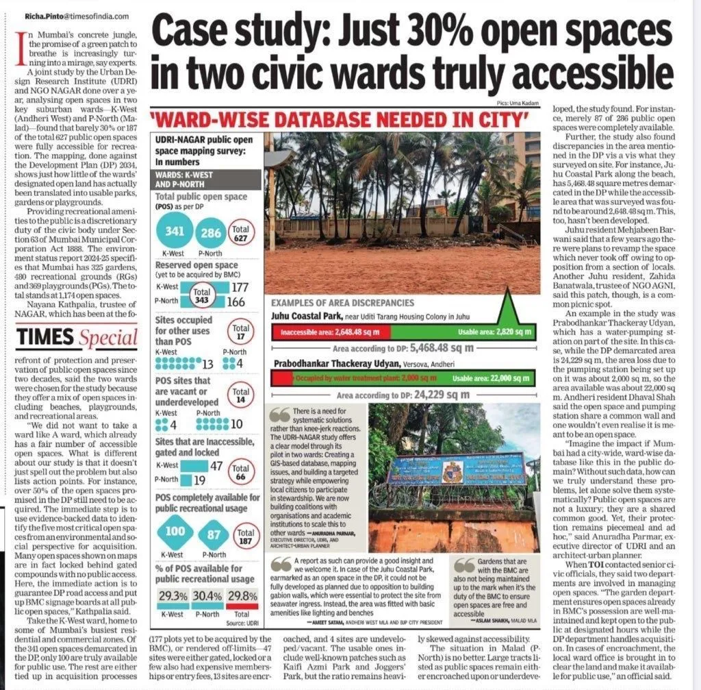 A joint NAGAR + UDRI study of Development Plan (DP) demarcated spaces in two of the city’s densest wards: P-North (Malad) and K-West (Andheri West) reveals a stark reality: only 30% of public open spaces are truly accessible.